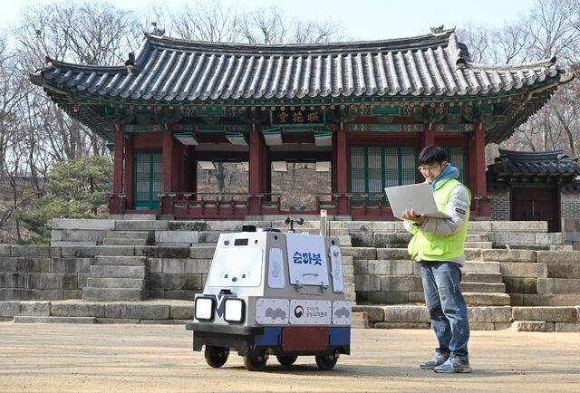 국가유산청 관계자가 지난 20일 서울 종로구 창덕궁 후원에서 자율순찰로봇 ‘순라봇’의 점검기록을 살펴보고 있다. 순라봇은 매일 9차례 창덕궁을 순찰하면서 열화상 카메라와 고감도 마이크 등을 이용해 화재 이상소음 가스누출 등 위험 요소를 점검한다. 국가유산청은 다음 달 9일까지 1차 운영을 마치고 기능 보완과 평가 등을 거쳐 다른 궁·능으로의 확대 여부를 결정할 예정이다.