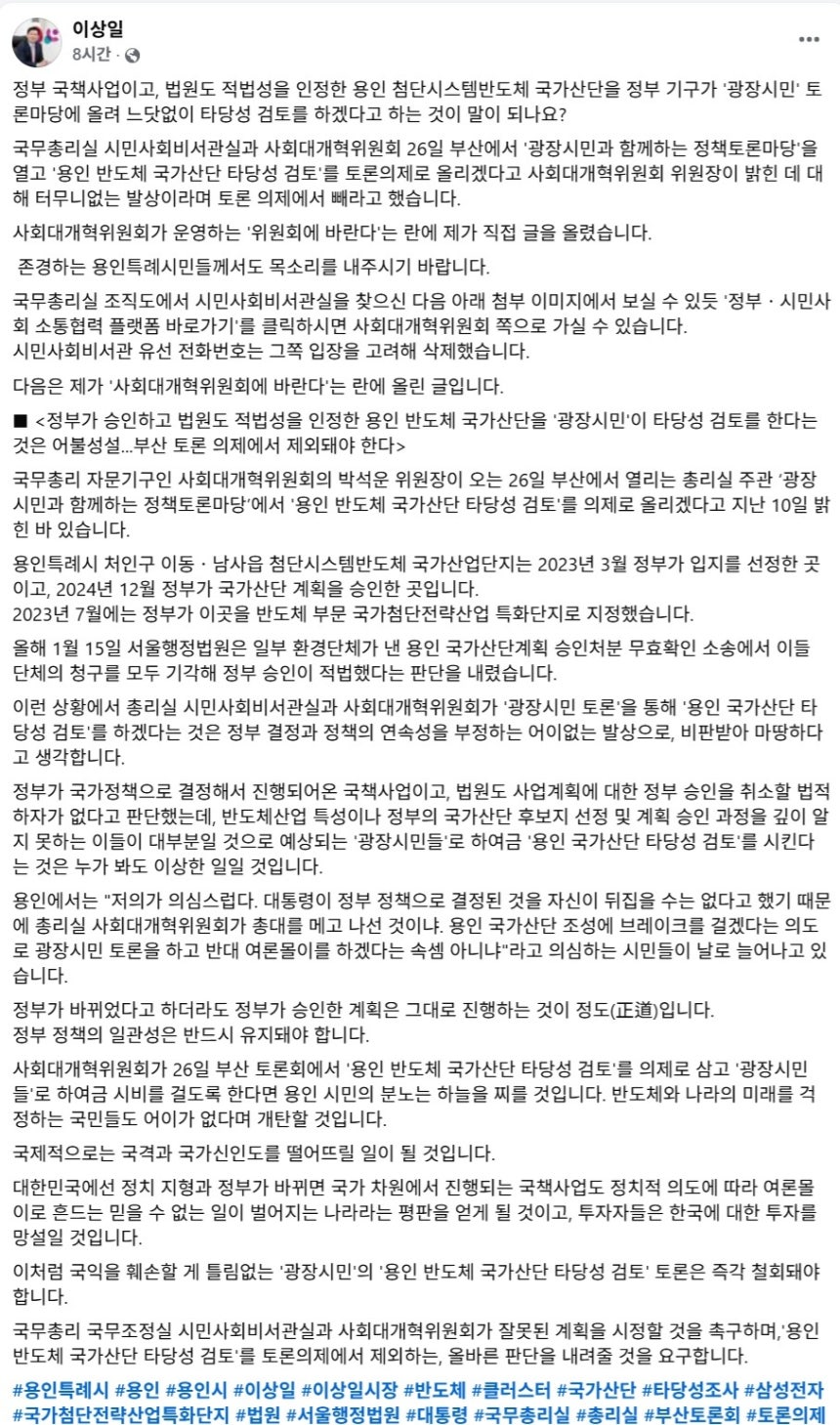 이 시장은 SNS에 해당 게시판 글을 공유했습니다. 그는 “정부가 바뀌었다고 하더라도 정부가 승인한 계획은 그대로 진행하는 것이 정도(正道)”라며 “정부 정책의 일관성은 반드시 유지돼야 한다”고 했죠. 이어 “정부가 국가정책으로 결정해 진행되어온 국책사업이고, 법원도 사업계획에 대한 정부 승인을 취소할 법적 하자가 없다고 판단했다는데, 광장시민들로 하여금 용인 국가산단 타당성 검토를 시킨다는 건 누가 봐도 이상한 일”이라고 꼬집었습니다.