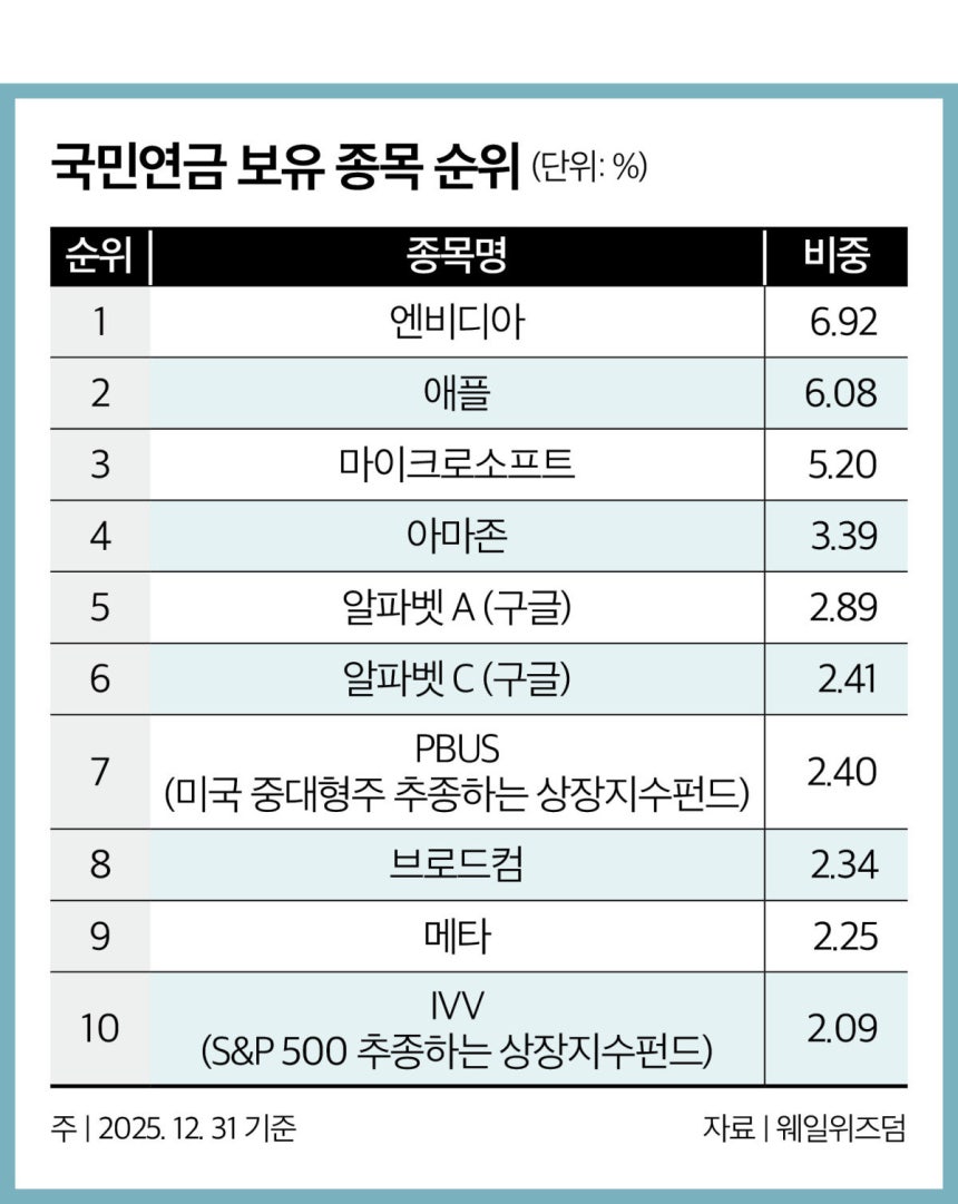 미국 주식 포트폴리오 내 비중 1위는 엔비디아(6.9%·93억4000만 달러)였다. 이어 애플(6.1%·82억1000만 달러), 알파벳(5.3%·71억6000만 달러), 아마존(3.4%·45억8000만 달러) 순이었다. AI 관련 기술주 중심 전략을 유지하면서 종목별로 비중을 조정하는 전술적 운용이 병행됐다.