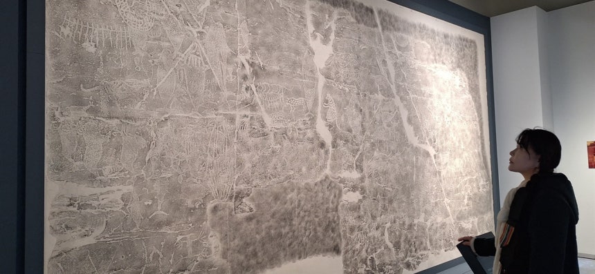국립세계문자박물관 특별전에 전시된 <대곡리 반구대 암각화 탁본> 앞에서 모련화가 김지련 작가가 작품을 관람하고 있다.