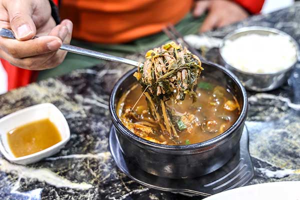 솔바람물소리 깔끔한 반찬과 매콤한 코다리찜이 지친 몸에 원기를 불어넣는다. 당골 입구의 이 식당은 30년 내공의 배국진 사장이 운영한다. 원래 오리탕과 백숙을 주력으로 했으나 코로나 시기 손님이 끊기면서 차별화된 메뉴를 고민하다 택한 것이 코다리찜이다. 리모델링해 5년째 영업 중이며 예약 손님 비중이 높을 만큼, 재방문율이 높다.