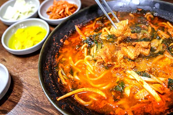 대명닭갈비 하산 후 꽁꽁 얼은 몸을 매콤하고 뜨끈한 국물로 풀어낸다. 태백 향토 음식인 물닭갈비 전문점이다. 태백 토박이인 어머니와 딸이 함께 운영한다. 물닭갈비 내공만 45년이 넘었다. 여 사장은 "태백 장성동에서 닭갈비 25년을 했고, 지금 이 자리에서도 20년 넘게 물닭갈비만 해왔다"고 한다. 태백 토박이가 만든 정통 물닭갈비인 것.