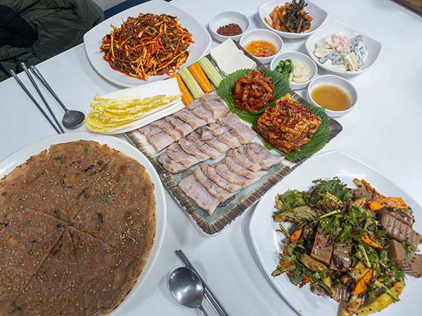 도토리 세트메뉴가 구성이 좋다. 넉넉한 보쌈 한 접시와 함께 도토리 전, 도토리 묵무침, 도토리 쟁반국수가 함께 나온다. 보쌈 한 접시에는 배춧잎, 두부, 무 무침과 배추김치 등이 함께 나온다. 무 무침과 배추김치가 간이 딱 맞아 곁들여먹기 좋다. 도토리 전을 적당히 잘라 함께 올려 먹어도 잘 어울린다. 쫄깃한 전의 식감이 수육의 담백한 맛과 어우러져 입안이 즐겁다.