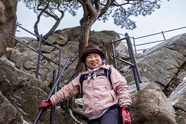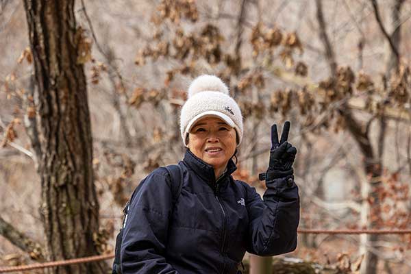 "쉬엄쉬엄 가면 하나도 안 아파요" 유복순(70) 경기 남양주 앞서 두 번의 인터뷰를 퇴짜 맞고 의기소침해 있는 사이, 저 멀리 걸어 내려오는 중년 여성. 귀여운 털방울이 달린 모자를 쓴 그녀를 멈춰 세웠다. "잠깐 시간 되시냐"는 말에 그녀는 기꺼이 시간을 내주었다. 남양주에 사는 그녀는 10년 전부터 꾸준히 도봉산에 다닌다. 도봉산을 '오르기'보다는 '다니는' 것에 가깝다. "욕심내지 않고 '가다말다' 하면 무릎 건강도 괜찮다"고 말한다. 이제는 자녀도 결혼해서 독립하고, 호젓이 산행하는 것이 그녀의 취미이다.