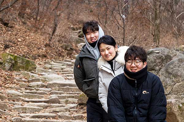 "부처님, 또 왔어요!" 이효진(50) · 허진서(25) · 허진영(21) 경기 안양시 처음엔 누나와 두 남동생인 줄 알았다. 그 정도로 엄마가 동안이었다. 패딩을 반쯤 내리고 헐떡거리는 모습이 얼핏 봐도 등산객은 아닌 것 같은데, 아니나 다를까 천축사에 가는 중이었다. 주말에 남편이랑 같이 오곤 했는데, 이번엔 방학을 맞이한 두 아들과 함께 왔다. 일 년에 두 번씩은 온다. "천축사는 큰 절은 아니다"며 "몇 년 전 세 번 오면 소원이 이루어진다는 말을 듣고 세 번 왔더니 정말로 좋은 일이 일어났다"고 말한다. 어떤 소원이었을까?