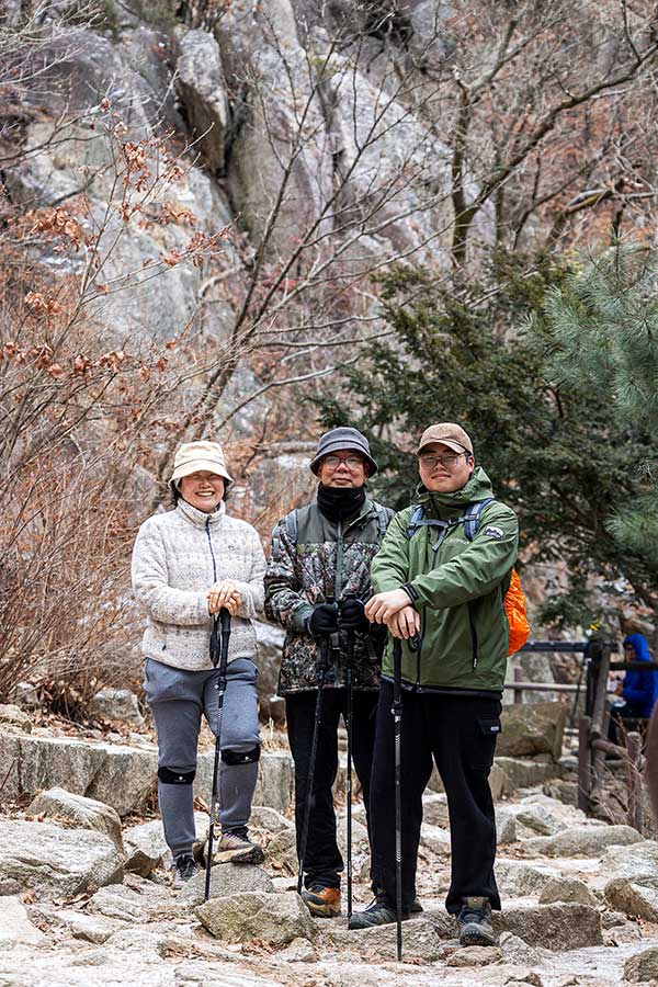 도봉산은 처음이라···" 박영남(59) · 박규민(21) 서울 강동구 누가 보더라도 아버지와 아들이었다. 아버지는 도봉산이 두 번째고, 아들은 처음인데, "산을 알아가는 중"이라고 한다. 아버지는 건설·토목업에서 종사하다 은퇴하고, 최근에 다시 일을 시작했다. 전선 지중화地中化, 즉 전선을 땅에 묻는 일을 하고 있다. 대학생인 아들은 요즘 대세인 반도체학과에 재학 중이다. 머지않아 국내 굴지의 반도체 제조기업 입사를 목표로 하고 있다. 이런 걸 부전자전이라고 하는 걸까?