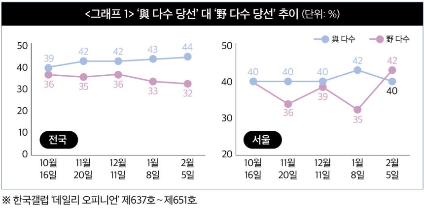 현재 서울시장 판세는 민주당과 국민의힘 선전 가능성이 교차하고 있다. 한국갤럽은 지난해 10월부터 올해 2월까지 ‘지방선거 결과 기대’ 결과를 발표하고 있다. 전국 단위에선 ‘여당 후보 다수 당선’과 ‘야당 후보 다수 당선’의 격차가 점점 확대되고 있다. 10월 16일엔 ‘여당 당선’과 39%로 ‘야당 당선(36%)’이 3%포인트로 접전 양상을 보였다. 그 뒤로 ‘여당 당선’의 우세가 조금씩 확산하다가 2월 5일엔 그 격차가 12%포인트까지 벌어졌다(<그래프 1> 참조).