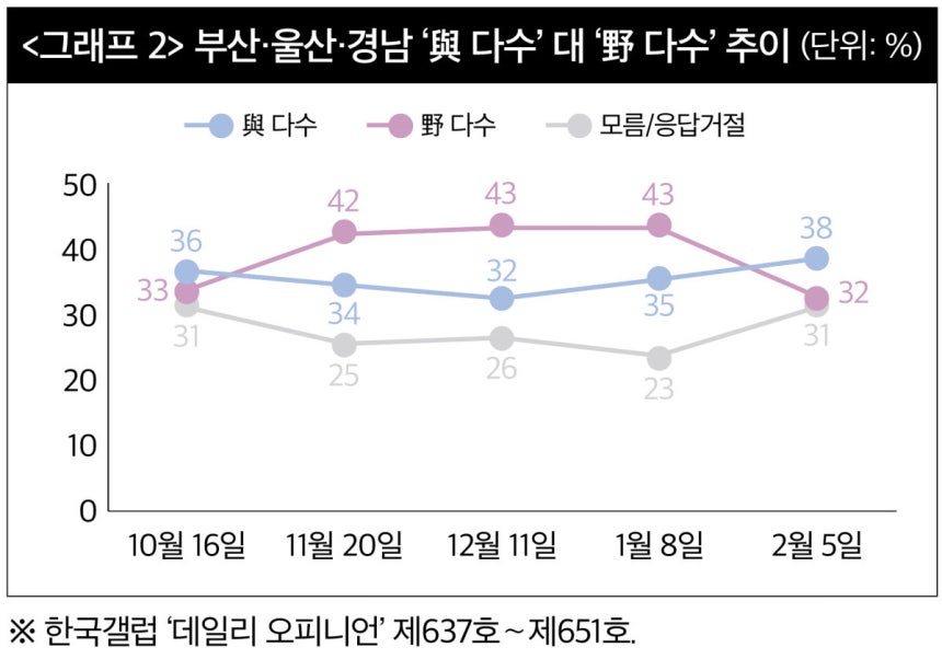 지난해 10월 16일 한국갤럽 여론조사에 따르면 ‘여당 당선’은 36%로 ‘야당 당선(33%)’에 3%포인트 차이를 보였다. 이때 ‘모름·응답 거절’은 31%였다. 11월∼1월에선 ‘야당 당선’이 42∼43%로 ‘여당 당선(34∼35%)’에 앞섰다. 같은 시기에 ‘모름·응답 거절’은 25∼23%로 눈에 띄게 줄어들었다. 2월 5일엔 ‘여당 당선’이 38%로 ‘야당 당선(32%)’에 앞섰는데 ‘모름·응답 거절’이 31%로 직전 조사보다 8%포인트 늘었다. 부산·울산·경남의 여론조사에선 과거 충청처럼 속내를 잘 드러내지 않는 특징이 나타나고 있다. 2024년 총선, 2025년 대선 여론조사에서도 민주당 선전이 점쳐졌으나 결과는 국민의힘 우세였다. 수도권, 충청권에서 큰 타격을 받았던 두 번의 선거에서 국민의힘의 구원투수로 등장한 곳이 바로 부산·울산·경남이다. 최근 이곳의 민주당 지지율이 고공 행진을 벌이고 있지만 여론조사의 행간을 읽어보면 국민의힘 지지율도 여전히 버티고 있음을 알 수 있다.