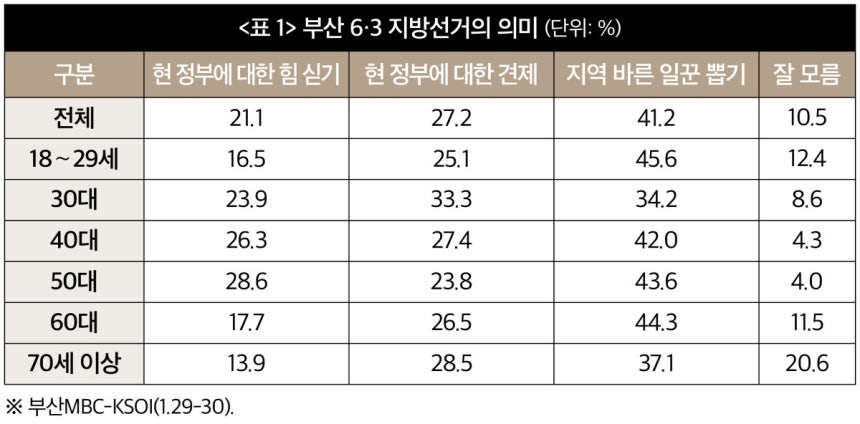 부산시장 판세는 아직 오리무중이다. 출마 후보군도 여전히 윤곽이 드러나지 않았을뿐더러 판세 예측도 쉽지 않다. 지난해 말과 올해 초를 거치면서 부산은 해양수산부 이전, HMM 부산 이전 추진, 가덕도 신공항 재추진 등으로 민주당의 선전 가능성이 점쳐졌다. 그러나 전 의원의 ‘통일교 의혹’이 터져 나오면서 불확실성이 커졌다. 1월 29∼30일 무선ARS로 실시된 한국사회여론연구소(KSOI)의 여론조사 결과에는 부산의 고민이 담겨 있다. ‘부산 6·3지방선거의 의미’ 질문에 ‘현 정부에 대한 힘 싣기’ 21.1%, ‘현 정부에 대한 견제’ 27.2% 등으로 나타났다. ‘지역 바른 일꾼 뽑기’란 응답이 41.2%로 가장 많았다. 이 질문은 일종의 모범 답안으로 아직 결정을 하지 못했거나, 위장된 ‘힘 싣기’와 ‘견제’가 섞여 있다고 볼 수 있다. 아직은 변동 가능성이 크다는 얘기다(<표 1> 참조).