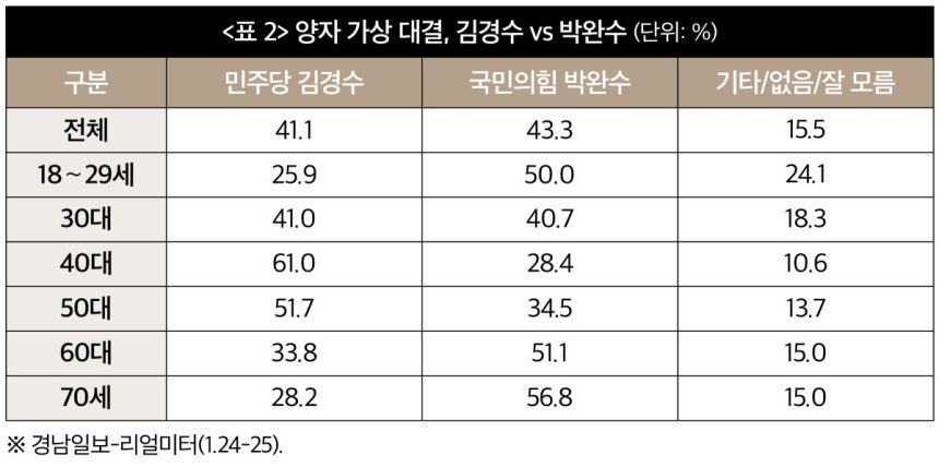경남지사 선거 판세는 접전지 중 가장 팽팽하다. 1월 24∼26일 무선ARS로 실시한 리얼미터 여론조사에 따르면 ‘민주당 김경수 vs 국민의힘 박완수 양자 가상 대결’은 우열을 가리기 힘들 만큼 팽팽했다. 김 위원장은 41.1%로 박 지사(43.3%)와 큰 차이가 없다. 김 위원장은 40대와 50대에서 강세를 보였고, 박 지사는 20·60·70대 등에서 우위였다. 30대에서는 거의 같은 지지를 받았다. 다만 박 지사의 20대 지지율은 50.0%였는데, 이는 다소 과다 반영된 측면도 있는 것으로 보인다. 이를 고려하면 김 위원장과 박 지사의 지지율은 거의 동률이나 마찬가지로 볼 수 있다(<표 2> 참조).
