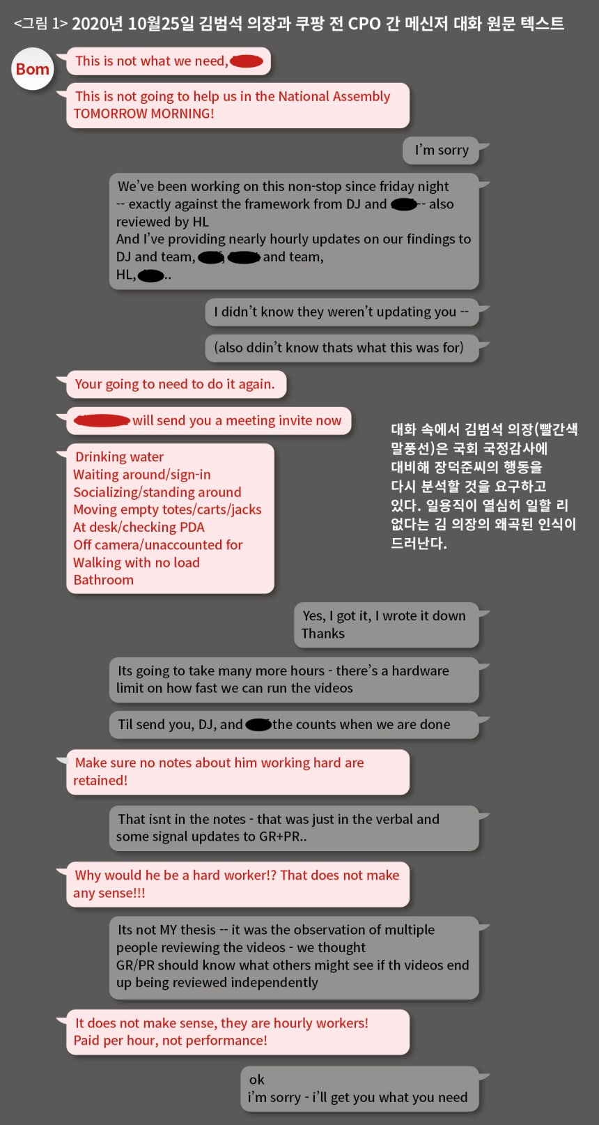 이렇게 모니터링한 내용을 김범석 쿠팡Inc 의장이 직접 확인한 정황도 포착됐다. 2020년 10월25일, 김범석 의장과 전 CPO는 장덕준씨의 동선을 모니터링한 내용에 대해 대화했고, 해당 메신저 대화 내용이 지난해 12월 언론에 보도되며 파장을 일으켰다. 당시 대화에서 김범석 의장은 일용직 노동에 대한 무지와 편견을 드러낸다. “그가 열심히 일한 것에 대한 기록이 없어야 한다!(Make sure no notes about him working hard are retained!)” “그가 왜 열심히 일하겠나!? 말이 안 된다!!!(Why would he be a hard worker!? That does not make any sense!!!)” “그들은 시간제 노동자다! 시간당 급여를 받는다. 성과제 노동자가 아니다!(They are hourly workers! Paid per hour, not performance!)”(〈그림1〉 참조)