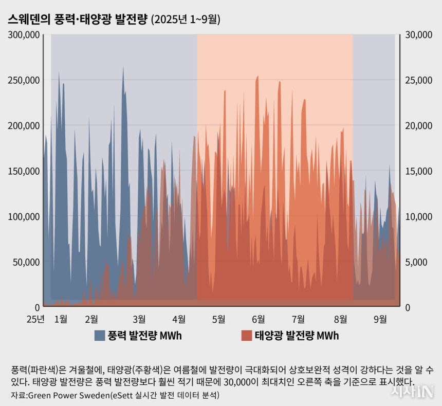 이뿐만 아니라 경직성 전원인 원자력의 경우 전력 생산량에 변동성이 큰 재생에너지와 상호 배타적 관계다. 재생에너지를 확대하겠다는 장기 목표와 원자력 확대는 공존하기 힘들다는 것이 안톤 요한손 부서장의 설명이다. 재생에너지의 전력 생산량에 따라 원전의 가동을 조절하는 출력 제어를 해야 하는데 이 경우 발전비용이 증가하고, 안전 문제가 야기될 수도 있다. 요한손 부서장은 지속 가능한 재생에너지 발전원들이 서로를 보완하는 그래프를 보여주며 이렇게 설명했다. “파란색은 추운 계절, 빨간색은 따뜻한 계절을 뜻한다. 따뜻할 때는 태양광 발전 량이 높게 올라간다. 반면 추울 때는 풍력발전 량이 두드러진다. 이 그래프에서 두 발전원의 상관계수는 -0.3으로 음의 관계다. 태양광 발전 량이 적을수록 풍력발전 량이 많아지고 반대로 태양광 발전 량이 많을수록 풍력발전 량이 적어진다는 의미다. 즉, 두 발전 방식이 서로를 보완한다는 것을 알 수 있다(〈그림 1〉 참조).”